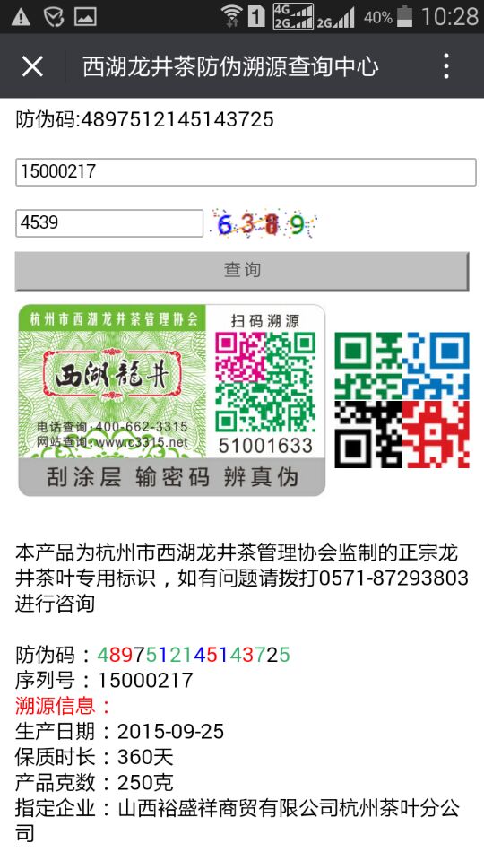 特點說明:此處的追溯信息不詳細是因為掃描的這個標簽是我們車間的半成品,未經龍井茶管理機構錄入更加詳細的信息。