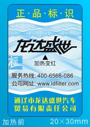 在防偽標簽印刷制作過程中,通過絲印將溫變熱敏油墨印在指定的標簽上,從而實現其防偽功能。樣標如下: